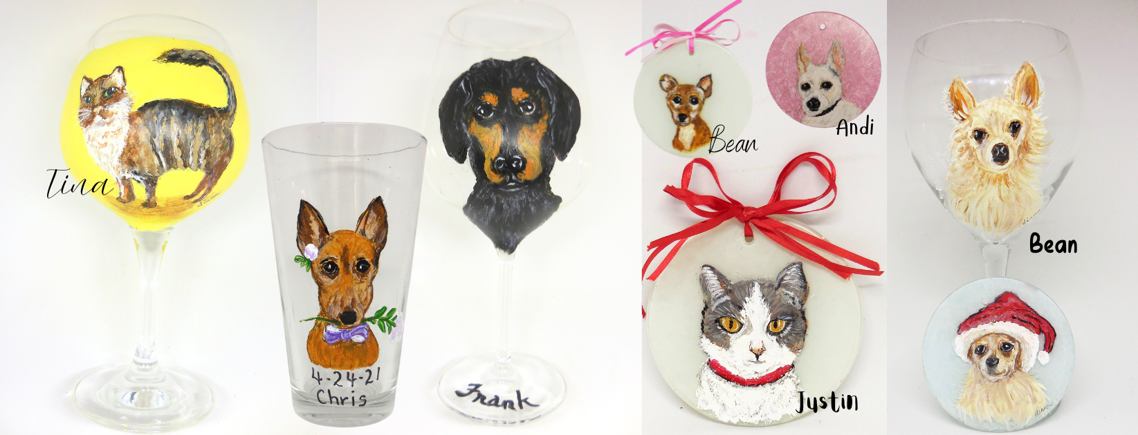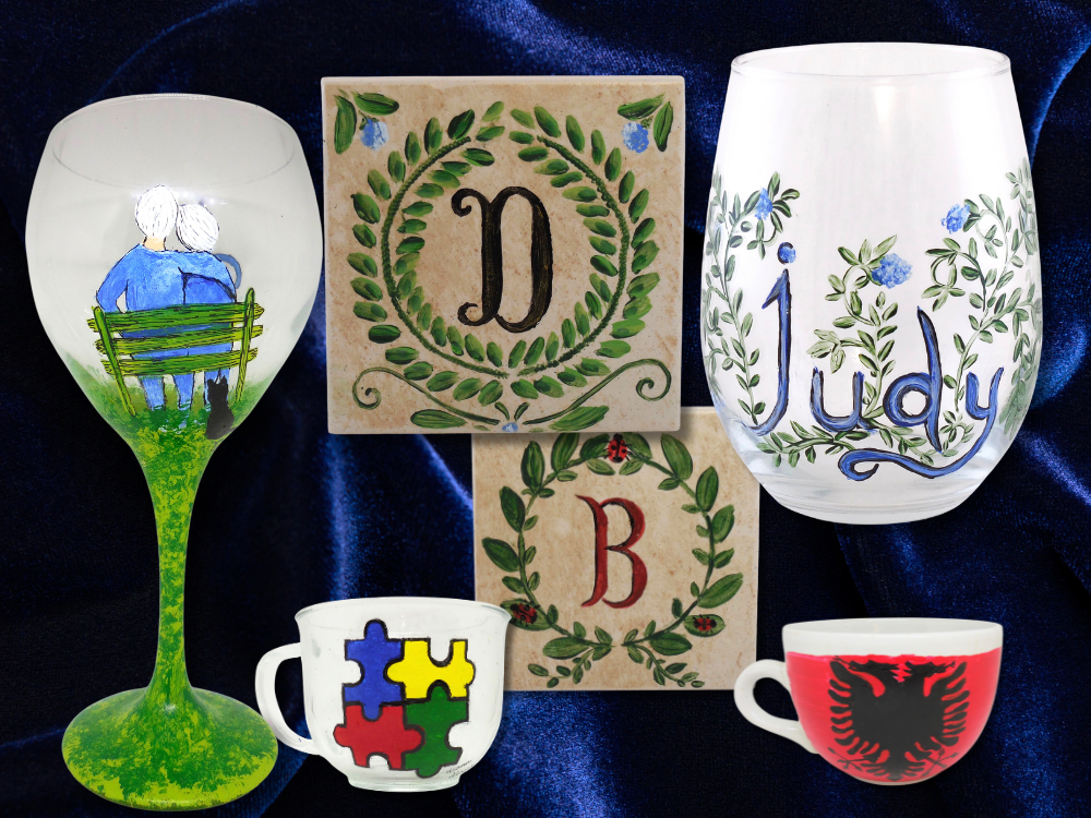 Custom Orders are hand-painted with enamel, on your choice of any combination of "canvases" - glass or wood ornaments, your choice of glassware, ceramic tiles, and yes, actual canvas.