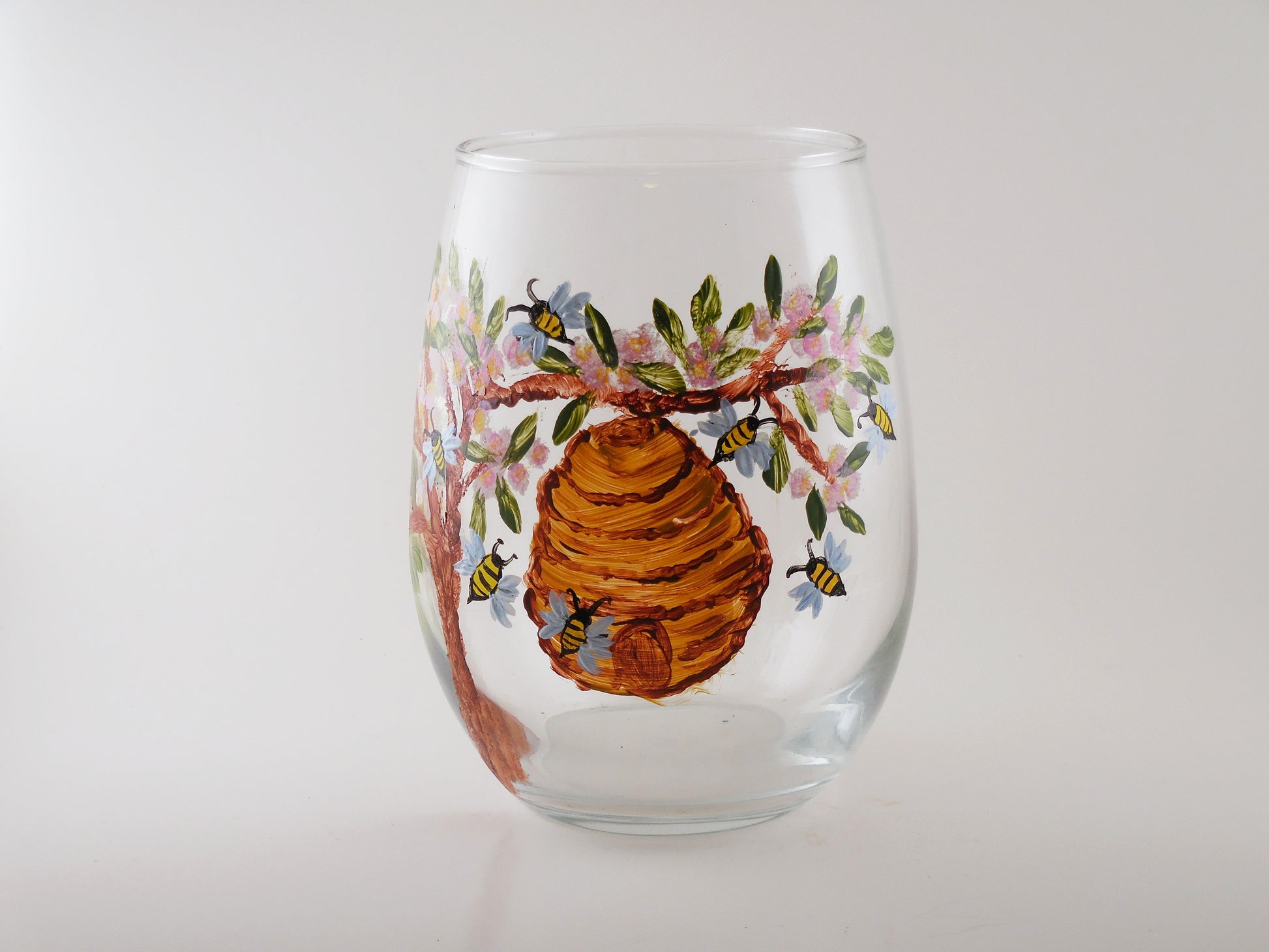 Sip in style with our Stemless Wine Glass featuring a Beehive Design. Hand-painted with a charming beehive surrounded by buzzing bees and delicate flowers, this glass brings a touch of nature's sweetness to your drinkware collection. Perfect for wine lovers and bee enthusiasts alike, it adds a delightful, whimsical flair to every sip.