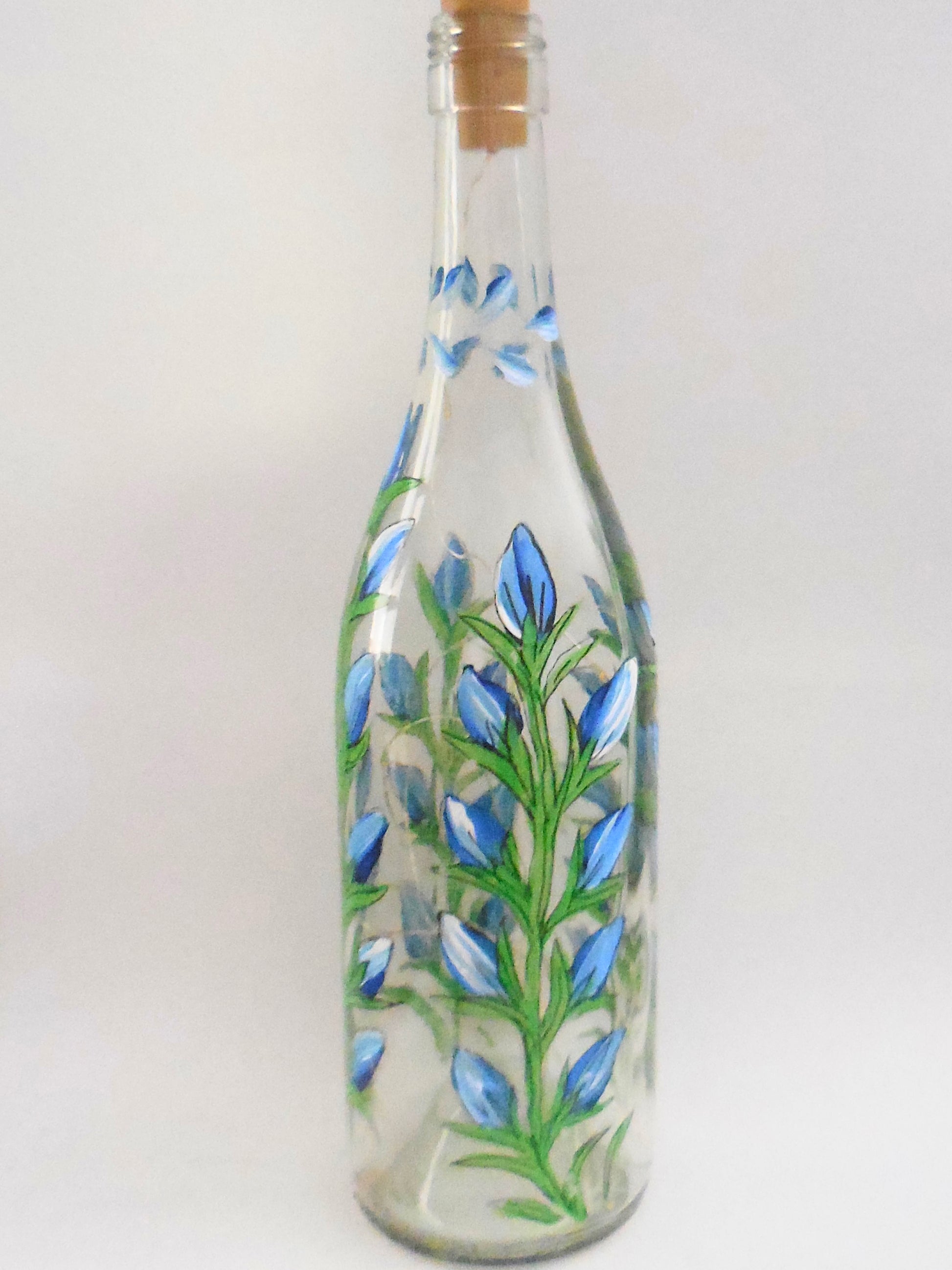 Brighten up any room with this hand-painted wine bottle featuring a stunning bluebonnet design, inspired by the beauty of Texas wildflowers. Filled with warm LED lights inside, this decorative bottle creates a soft, inviting glow, perfect for adding a touch of charm to your home décor or outdoor entertaining space. Whether displayed on its own or as part of a centerpiece, this unique piece offers a delightful blend of art and light. Battery-operated for easy placement, it makes a wonderful gift or keepsake.