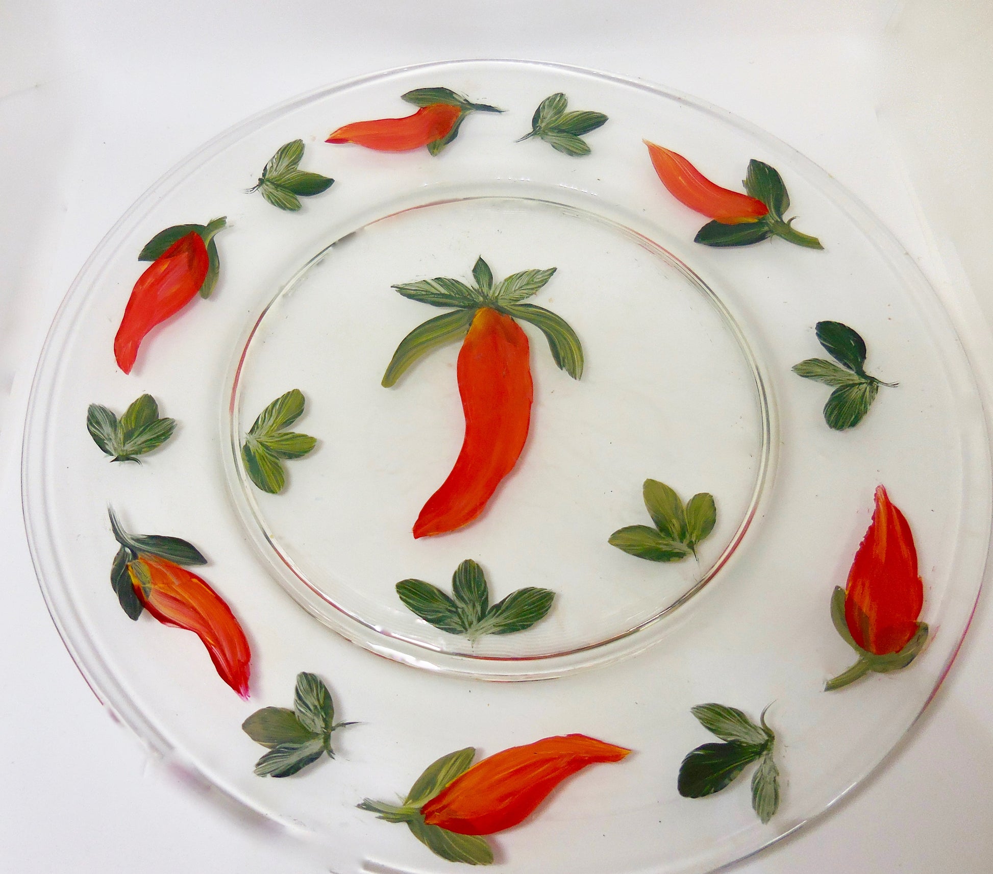 Spice up your table with our Chili Pepper Glass Plate. Hand-painted with vibrant chili peppers, this plate adds a zesty touch to your kitchen or dining area. Perfect for serving snacks, salads, or as a lively decorative piece, it combines bold design with practical functionality, making every meal a bit more flavorful.