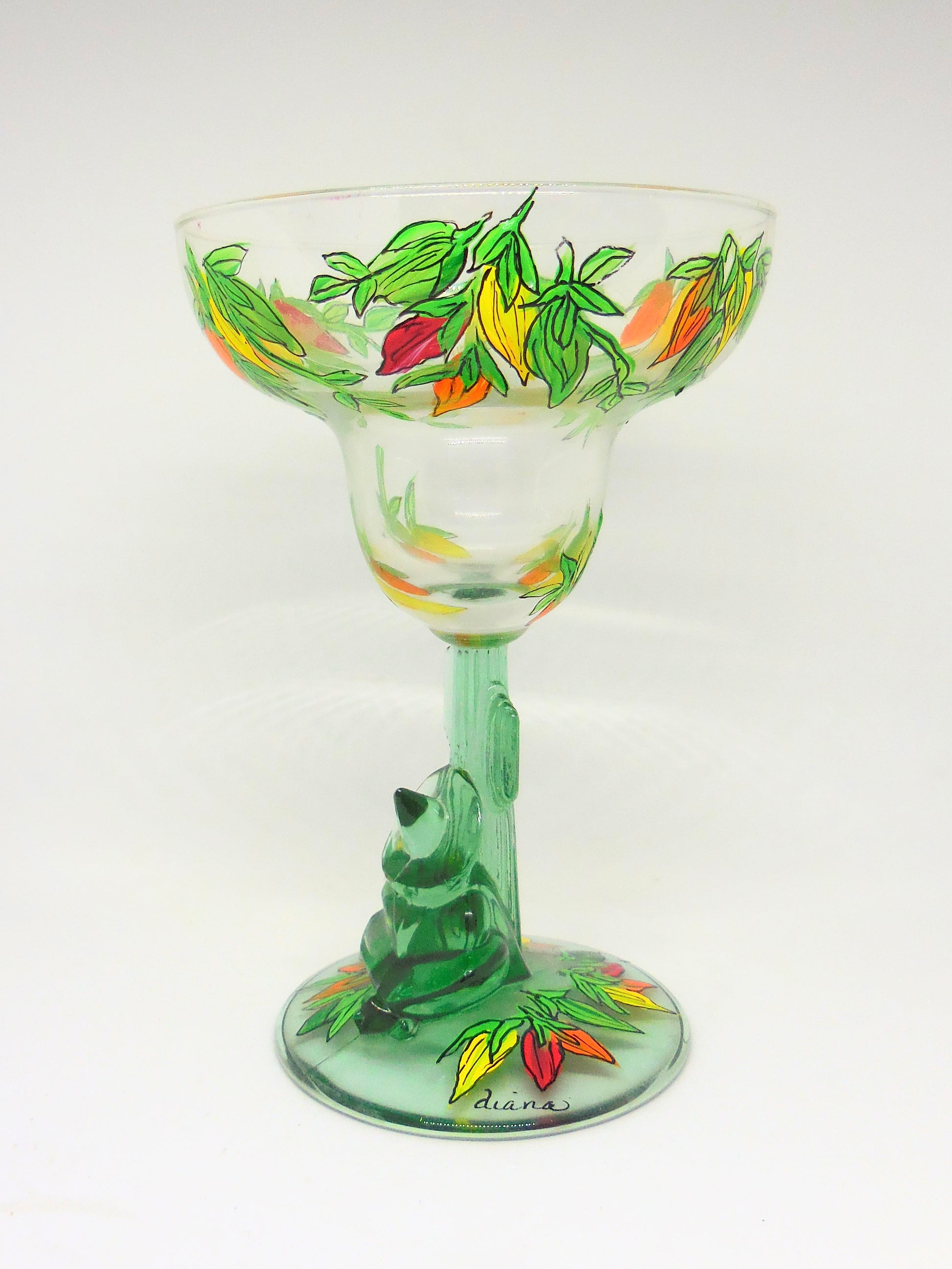 Spice up your sips with this festive margarita glass, hand painted with bright red, yellow, and orange chili peppers. Perfect for taco nights, summer fiestas, or anyone who loves a little heat with their happy hour.