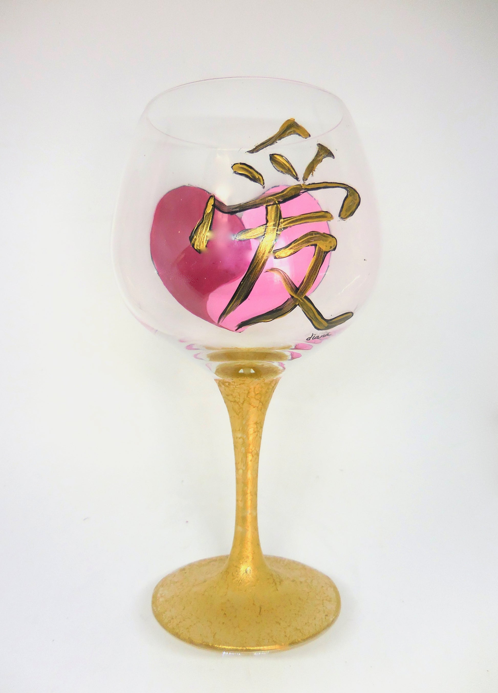 Experience elegance with a cultural touch with our Wine Glass featuringst the Chinese Symbol for Love. This glass is hand-painted with the graceful Chinese character for "love," complemented by a two-toned pink heart and a luxurious gold stem that adds a sophisticated flair. Perfect for romantic evenings, special occasions, or as a meaningful gift, this glass blends timeless symbolism with refined design for a truly unique drinking experience.