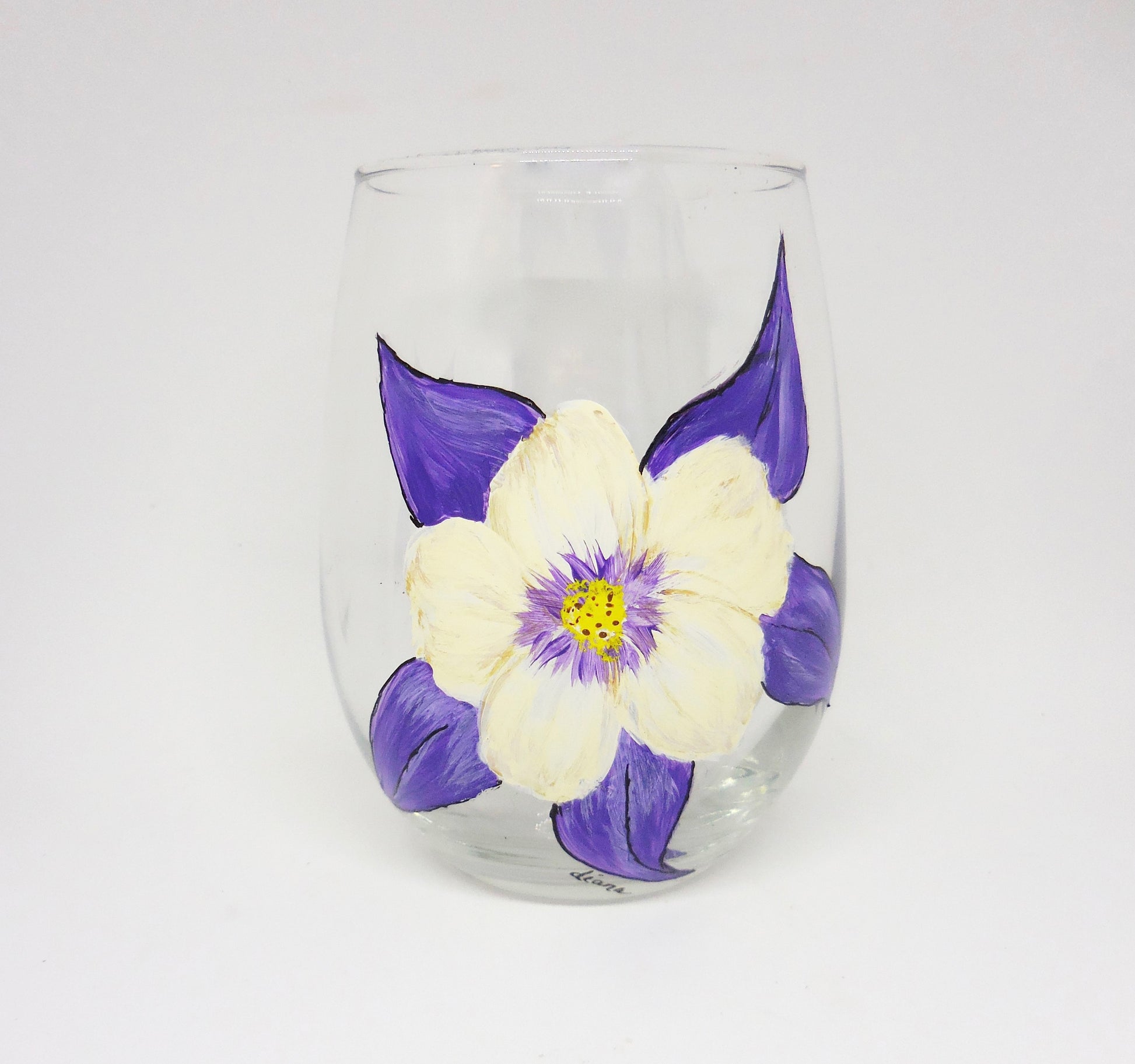 Embrace the beauty of Colorado with our Stemless Wine Glass featuring the Colorado State Flower, the Rocky Mountain Columbine. Hand-painted with delicate blue and white petals of this iconic flower, this glass captures the natural elegance and vibrant spirit of the state. Perfect for adding a touch of Colorado's charm to your collection or as a thoughtful gift, it combines floral artistry with everyday practicality.