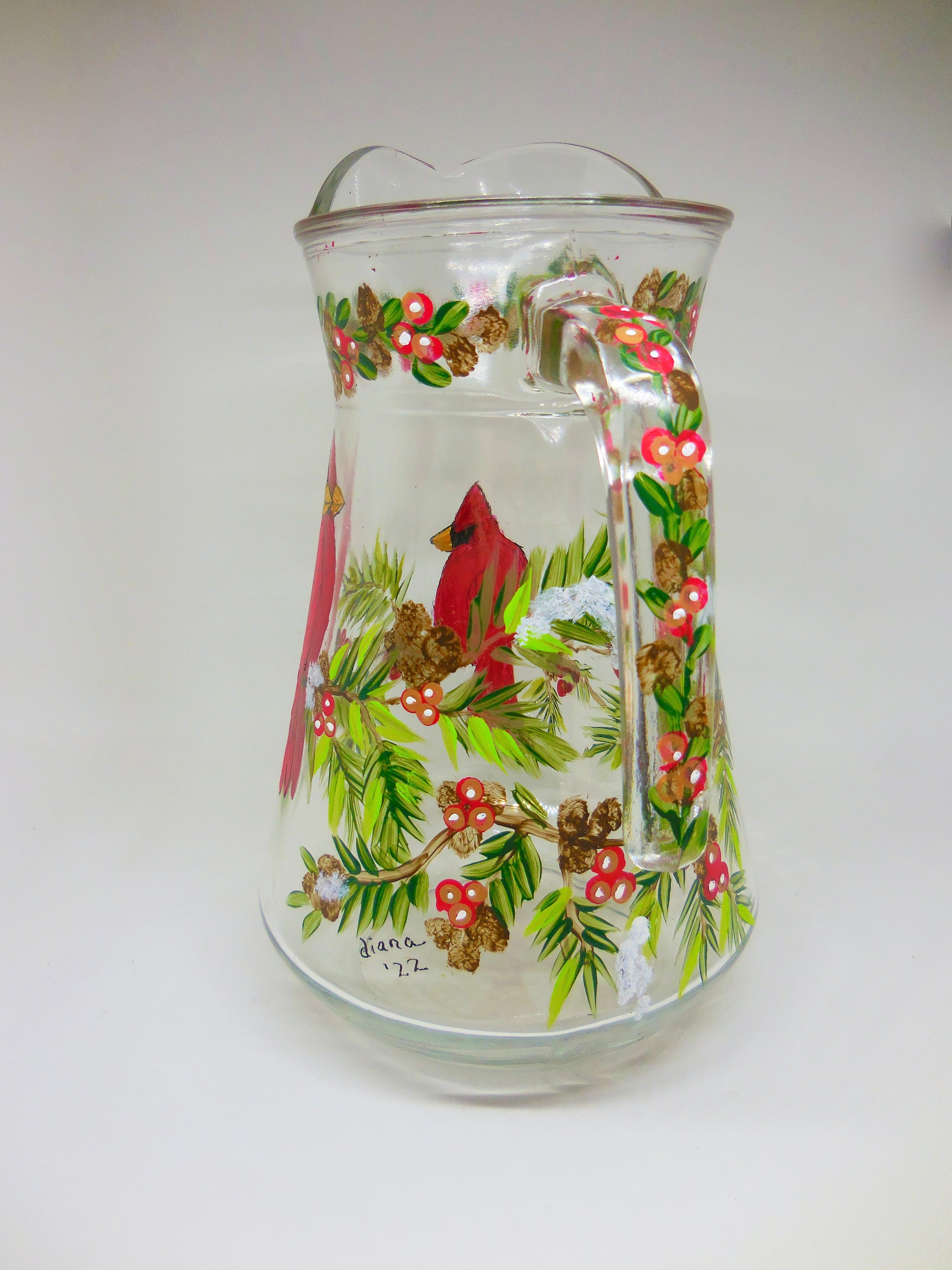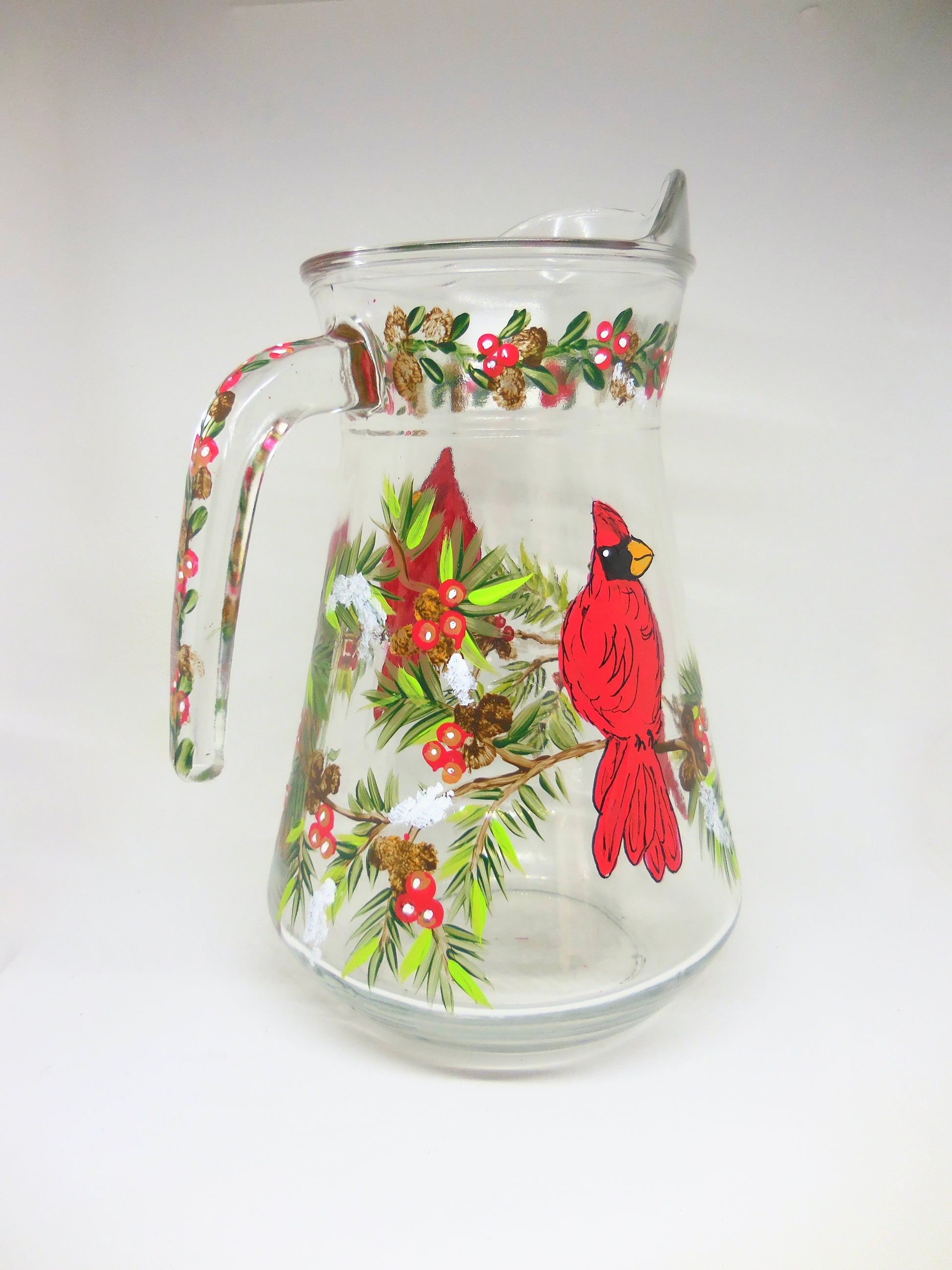 Serve with seasonal charm using our Cardinal Glass Pitcher. Adorned with a hand-painted cardinal amidst a wintry scene, this pitcher combines elegance with a touch of nature’s beauty. Ideal for entertaining or daily use, it adds a vibrant splash of color to any table setting. Elevate your beverages and enjoy the grace of winter’s finest bird with every pour!