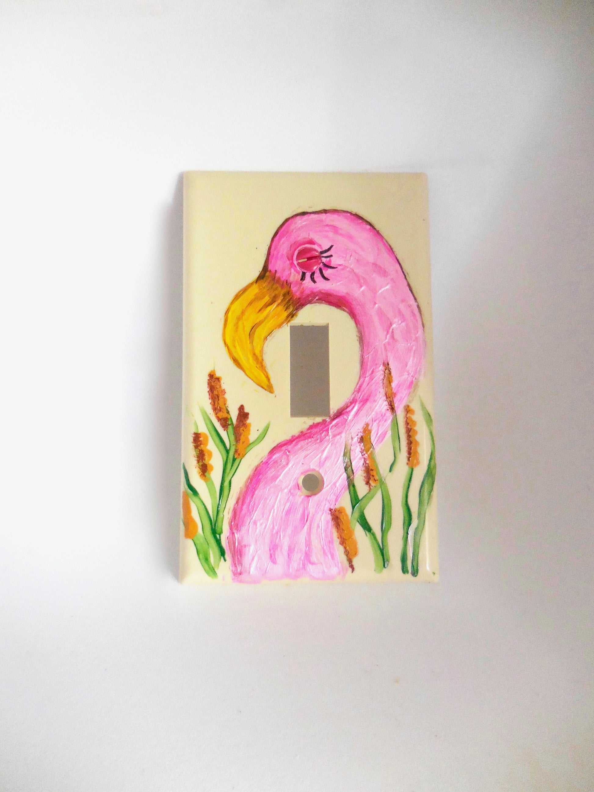 Brighten up your space with our Flamingo Switchplate Cover. Hand-painted with a delightful flamingo design, this cover adds a splash of tropical charm to any room. Perfect for adding a playful touch to your décor or as a unique gift, it combines whimsical artistry with practical functionality, transforming your light switch into a cheerful focal point. Screws included.