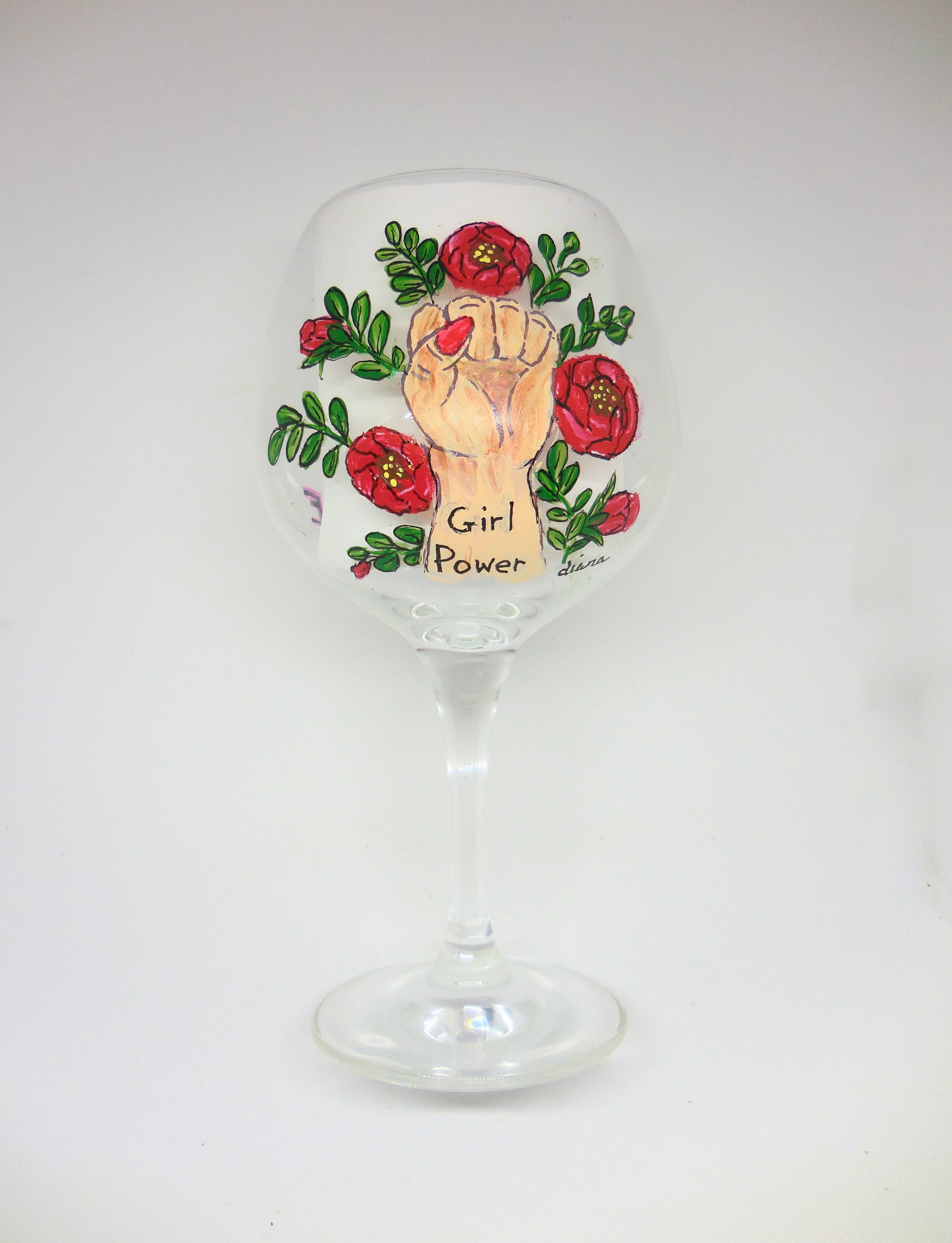 Empower your sipping moments with our Girl Power Wine Glass. Hand-painted with a bold design of a raised woman's fist adorned with red nails, surrounded by vibrant roses, this glass celebrates strength and femininity. Perfect for toasting to accomplishments or simply enjoying a glass of wine with a touch of empowerment and floral elegance.
