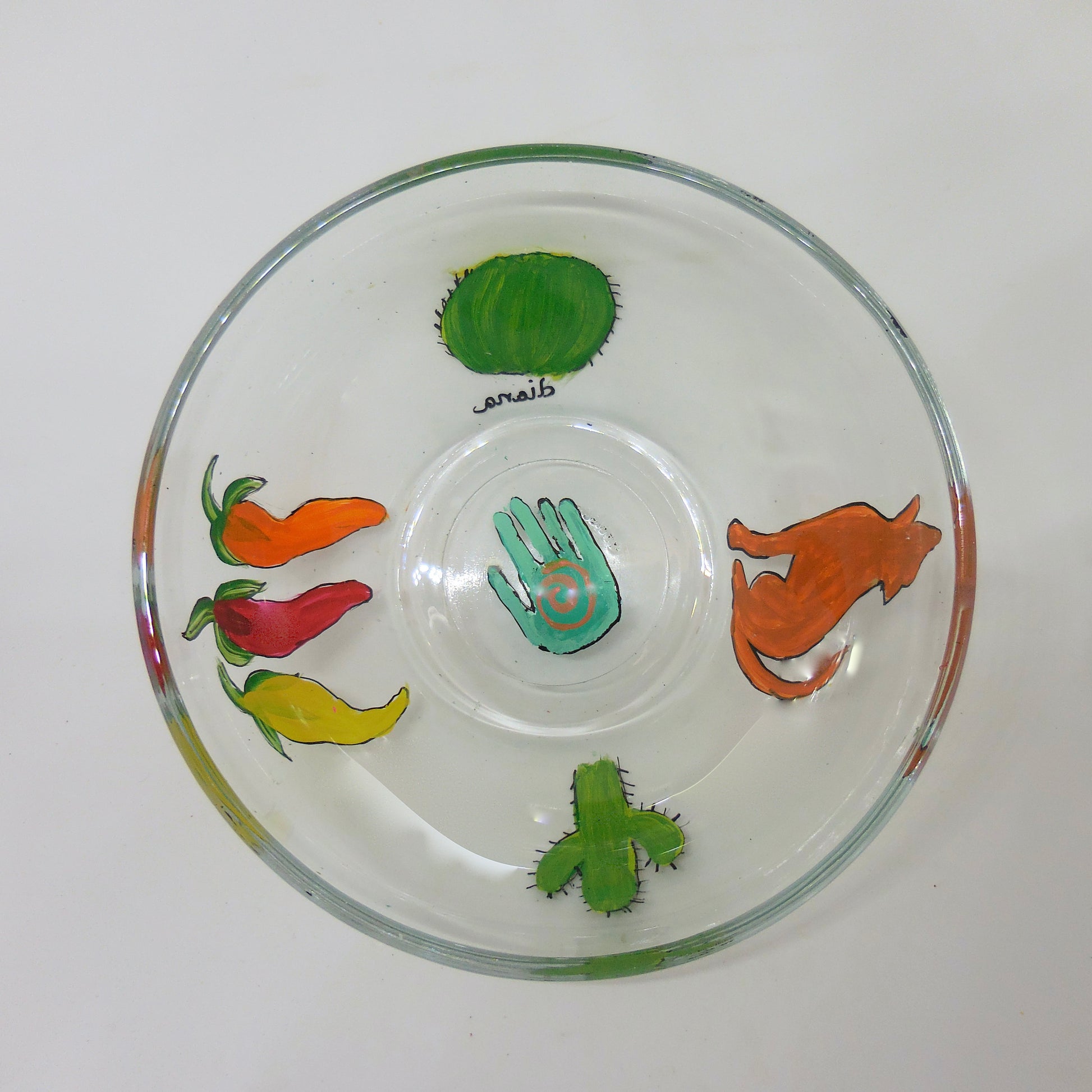 Celebrate Southwestern charm with our Glass Bowl featuring Kokopelli, Coyote, Peppers, and Cactus. Hand-painted with the iconic Kokopelli figure, a playful coyote, vibrant peppers, and resilient cacti, this bowl captures the spirit of the desert. Perfect for adding a touch of rustic elegance to your home, it combines cultural artistry with practical design for a unique and eye-catching piece.