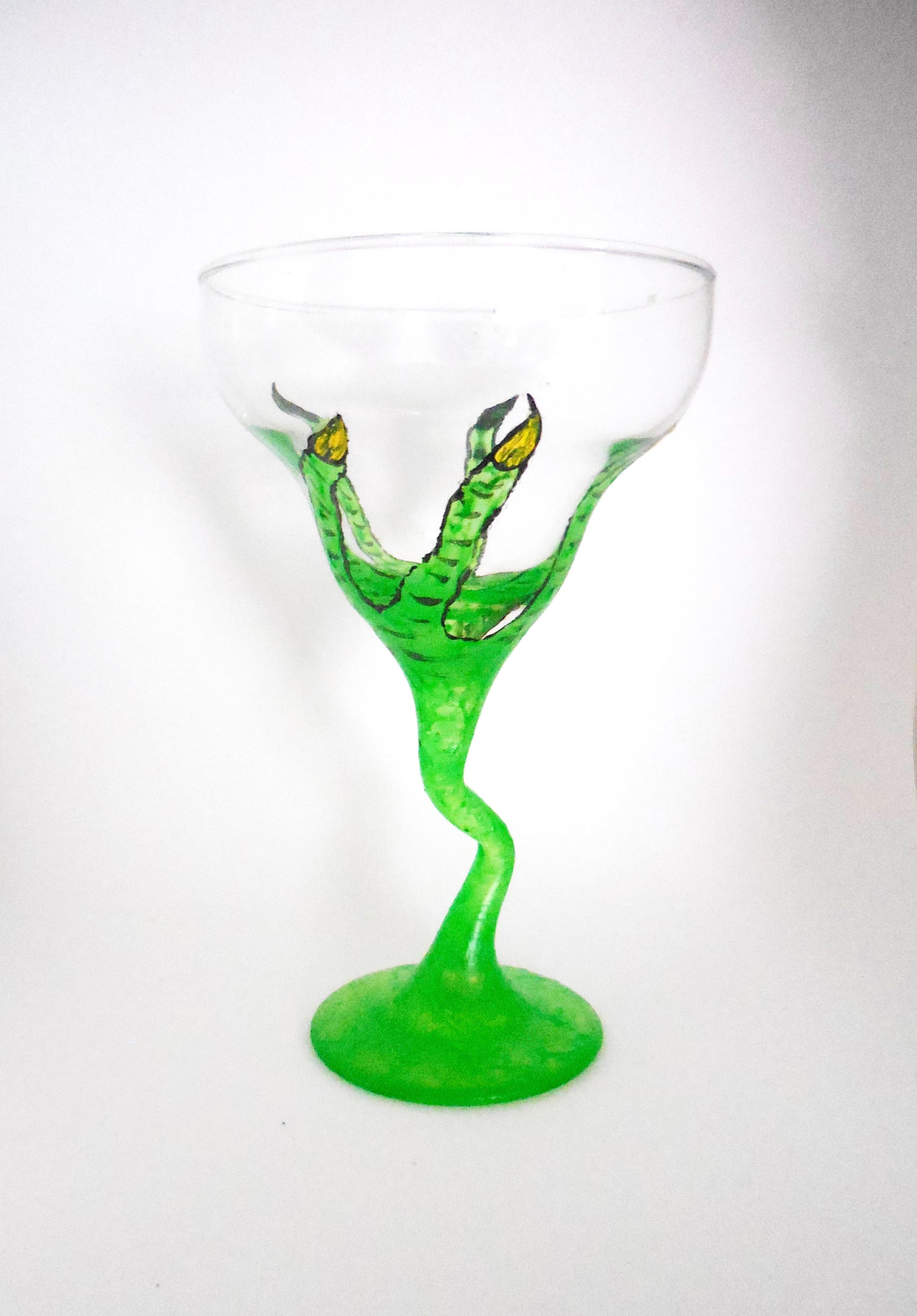 Spice up your Halloween festivities with our Green Fingers Martini Glass. Hand-painted with eerie green witch fingers reaching up from the stem, this glass adds a spooky and playful touch to your cocktails. Perfect for Halloween parties or themed gatherings, it combines a touch of fright with festive fun.