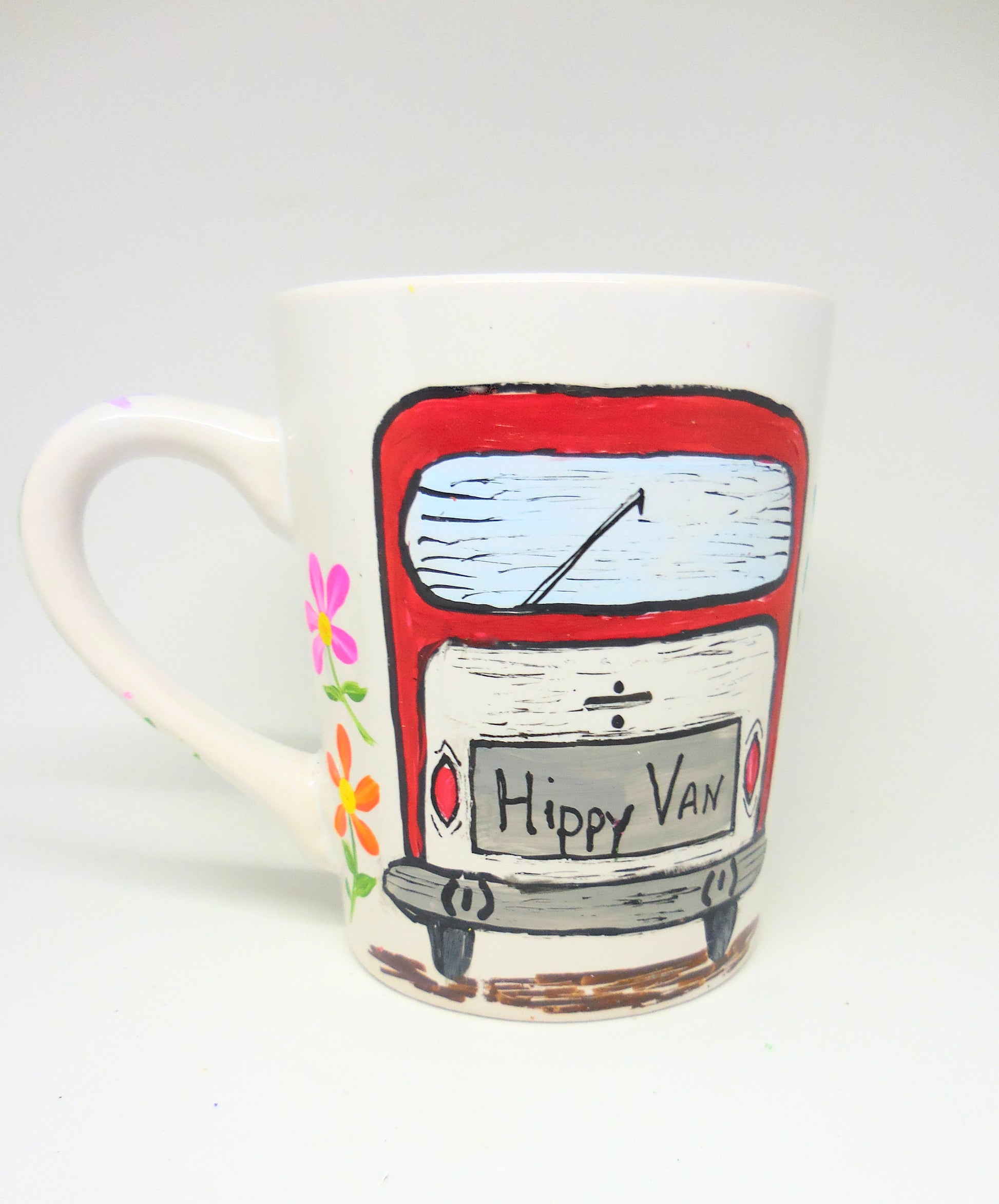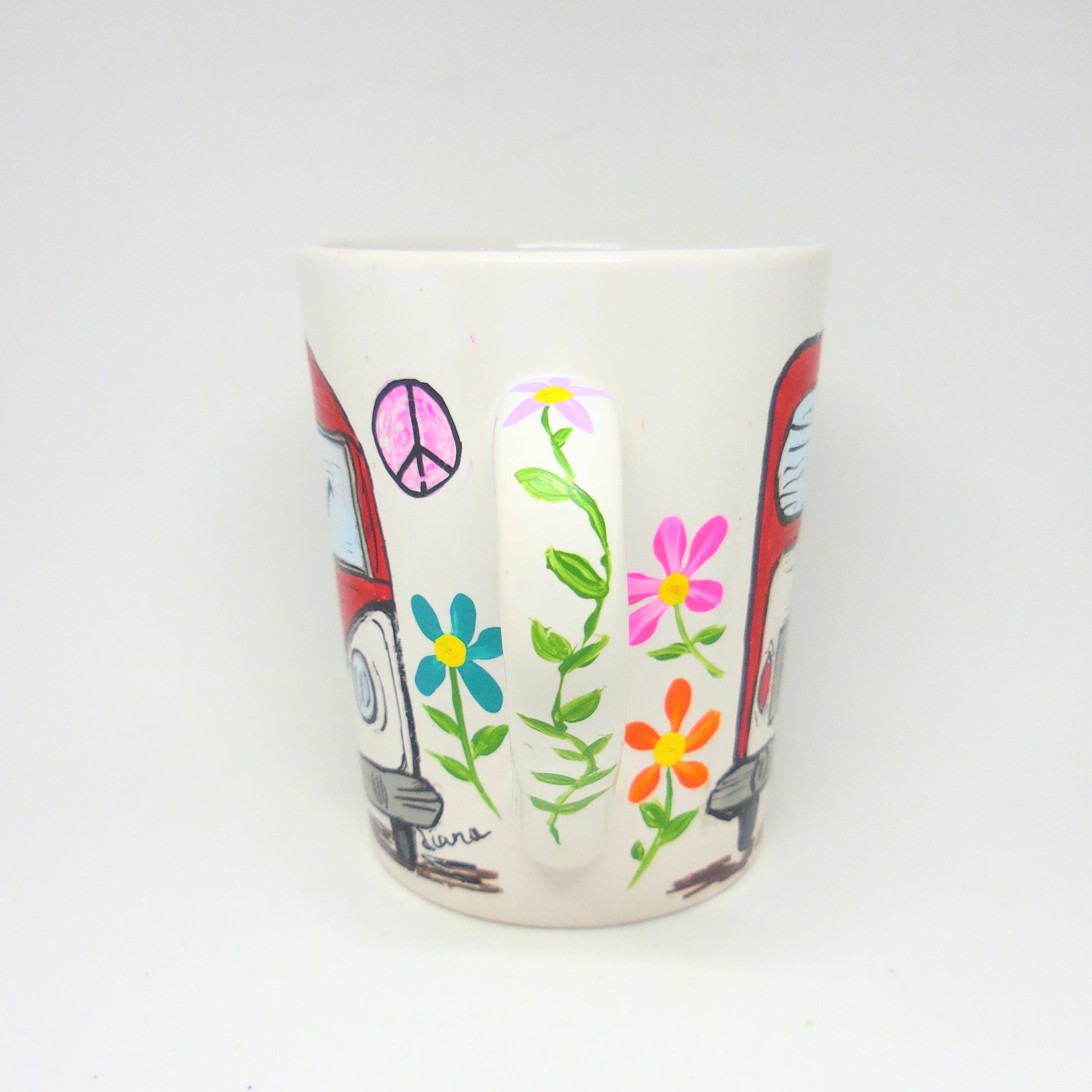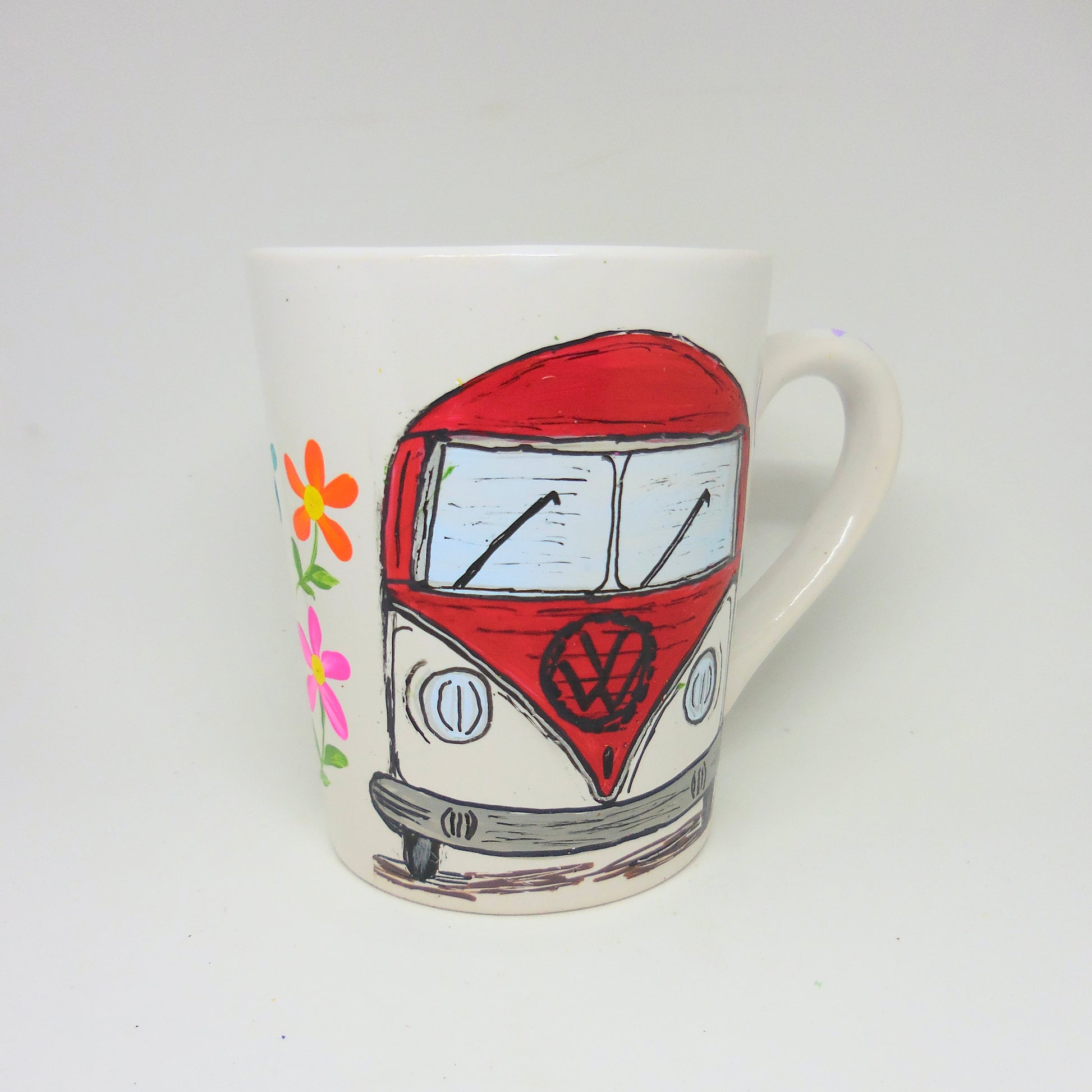 Start your day with a touch of retro charm using our Coffee Mug featuring a Red Hippy Van. Hand-painted with a vibrant, classic hippy van design, this mug brings a sense of adventure and nostalgia to your morning routine. Perfect for coffee lovers and those with a free-spirited soul, it combines fun design with practical use for a delightful sipping experience.