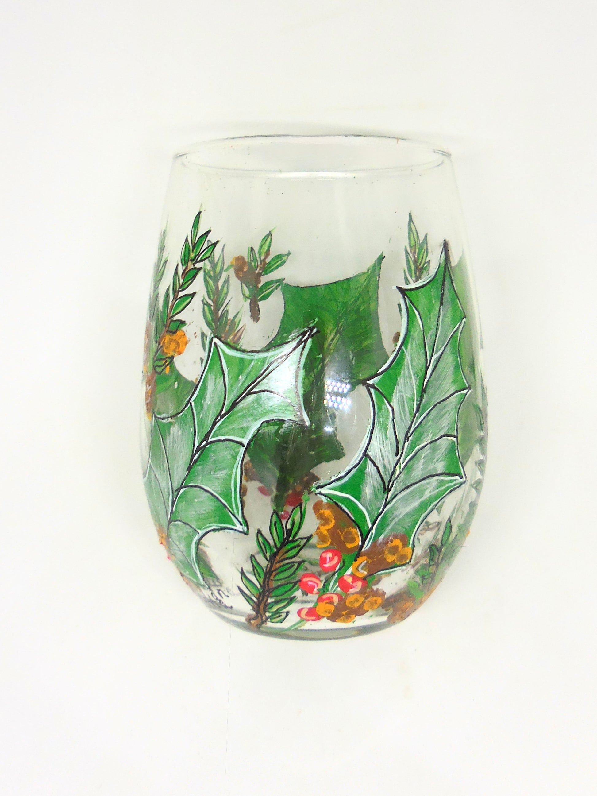 Celebrate the season with this festive hand-painted wine glass featuring sprigs of holly and pine. Rich green leaves, bright red berries, and pine accents wrap around the glass, creating a timeless holiday look. Perfect for Christmas gatherings, winter entertaining, or gifting to someone who loves seasonal décor.