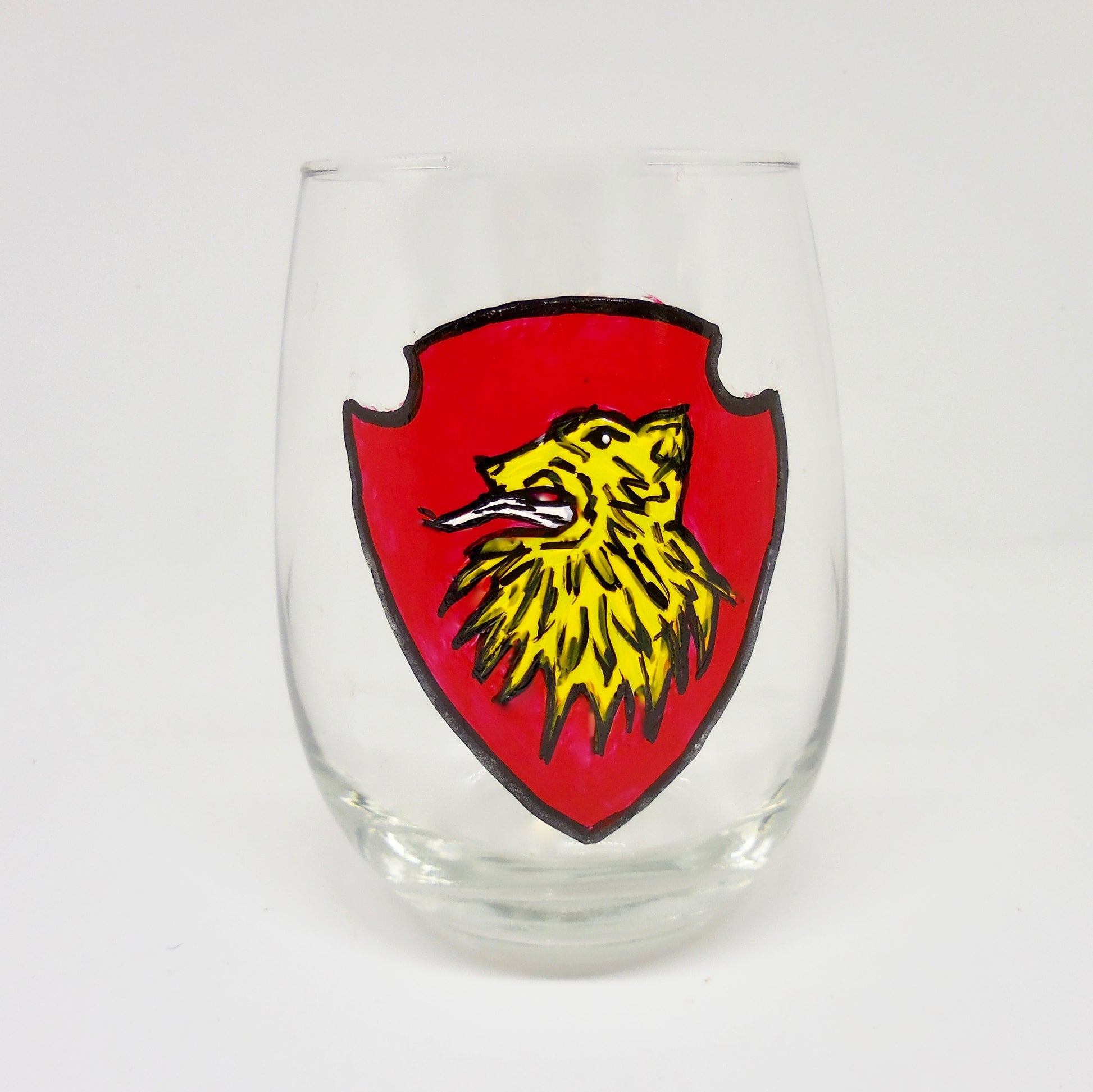 Channel your inner Lannister with our Stemless Wine Glass featuring the House of Lannister Shield. Hand-painted with the iconic red and gold lion emblem, this glass adds a touch of Westerosi grandeur to your wine-drinking experience. Perfect for Game of Thrones fans and those who appreciate a blend of fantasy and elegance, it combines bold design with practical sophistication.