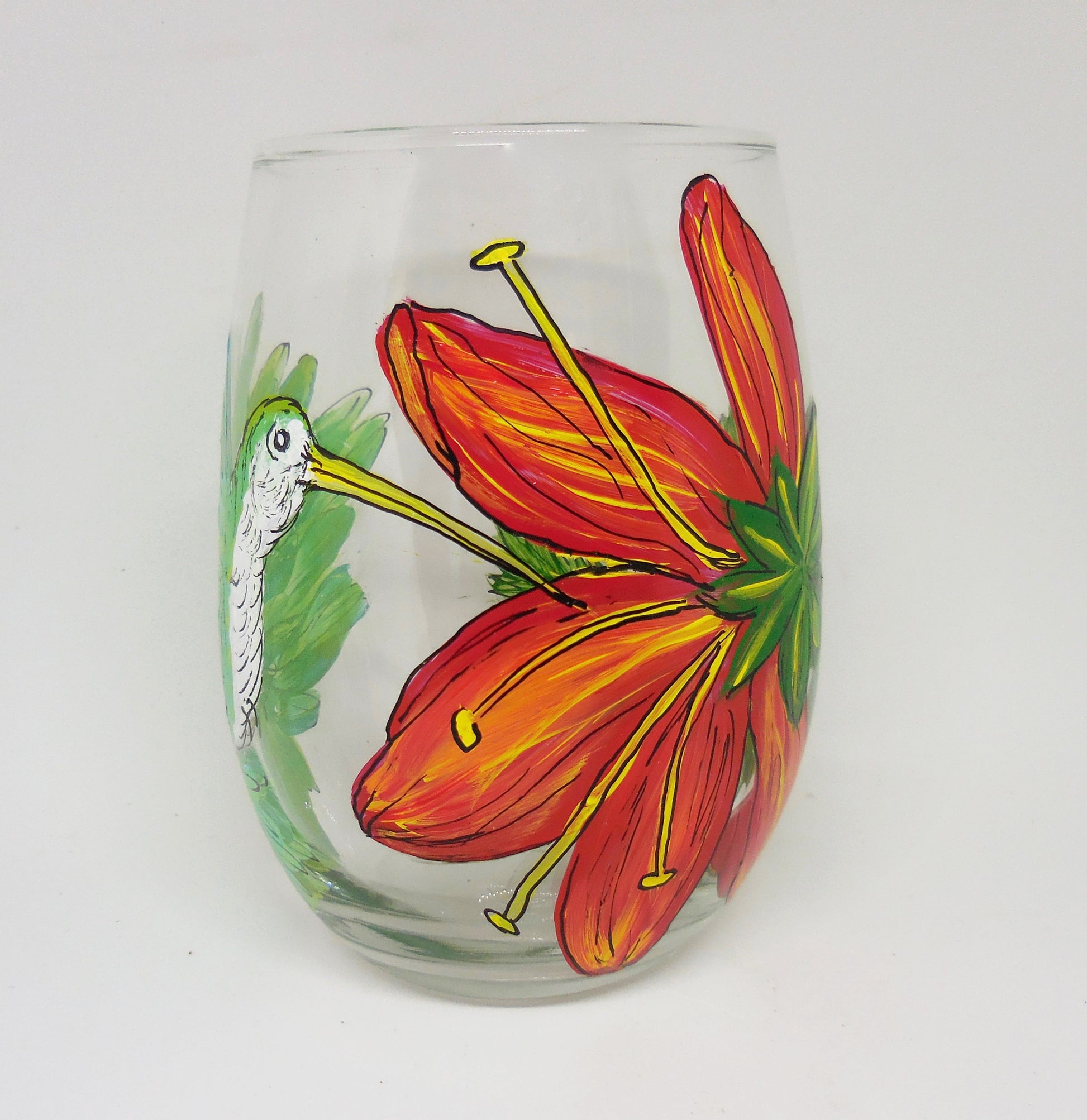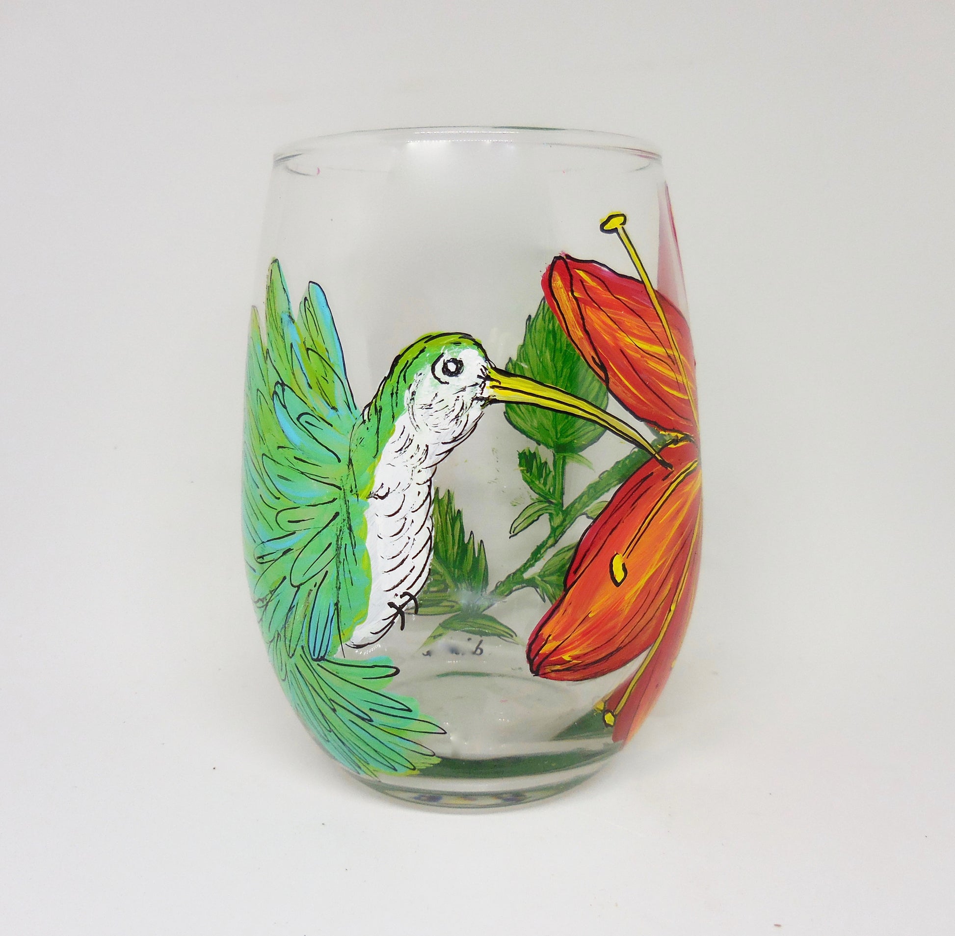 Brighten up your wine time with our Hummingbird Stemless Wine Glass. Hand-painted with a delicate hummingbird hovering near a vibrant red bloom, this glass combines the beauty of nature with elegant design. Perfect for adding a touch of floral charm to your gatherings or enjoying a serene moment, it’s a delightful addition to any glassware collection.