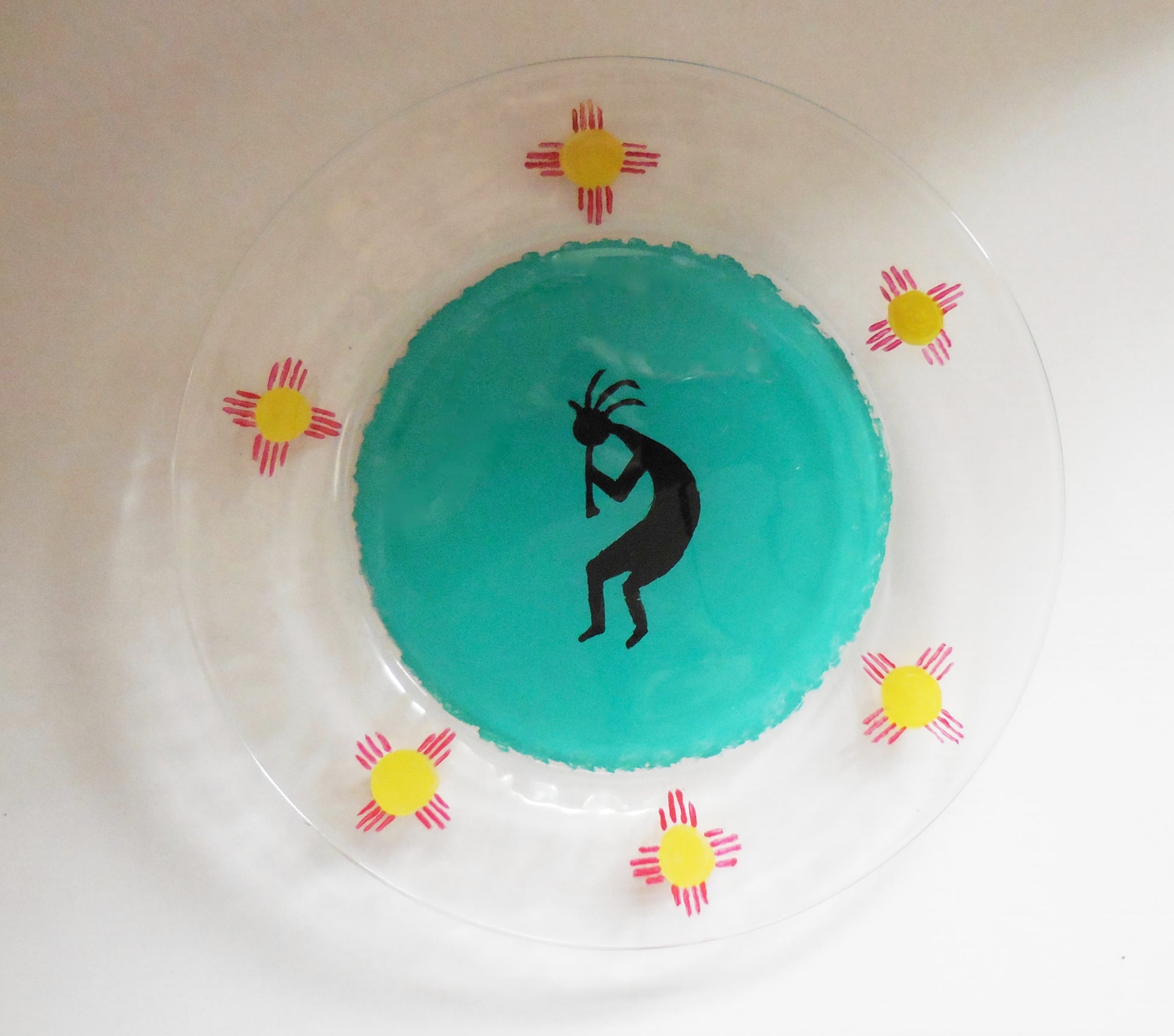 Bring a touch of Southwestern mystique to your dining experience with our Glass Plate featuring Kokopelli and Suns. Hand-painted with the iconic Kokopelli figure surrounded by radiant suns, this plate beautifully captures the spirit of desert folklore and the vibrant energy of the Southwest. Perfect for serving meals or as a decorative accent, it combines cultural symbolism with elegant design, making it a standout piece for any table setting.