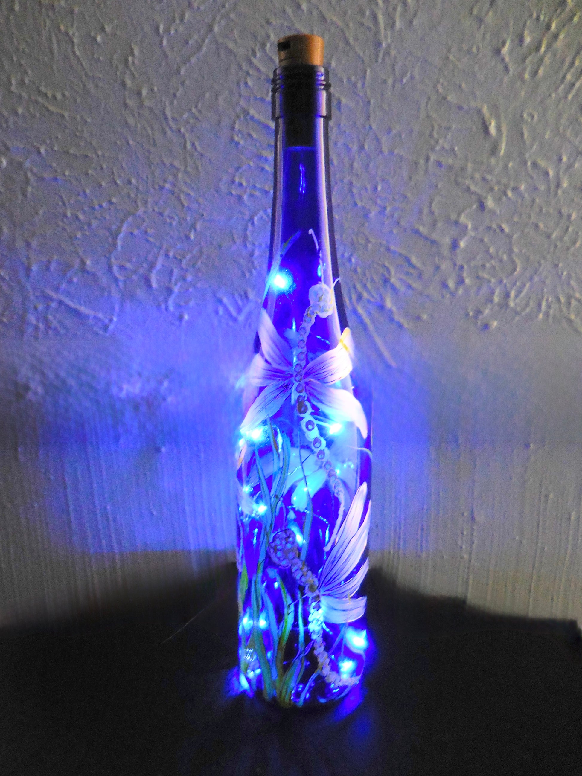 Add a magical glow to your space with this limited edition hand-painted cobalt blue wine bottle. Featuring delicate dragonflies in flight, each bottle is illuminated from within by soft LED lights, turning it into a charming piece of functional art. Perfect for a gift, centerpiece, or cozy corner glow.