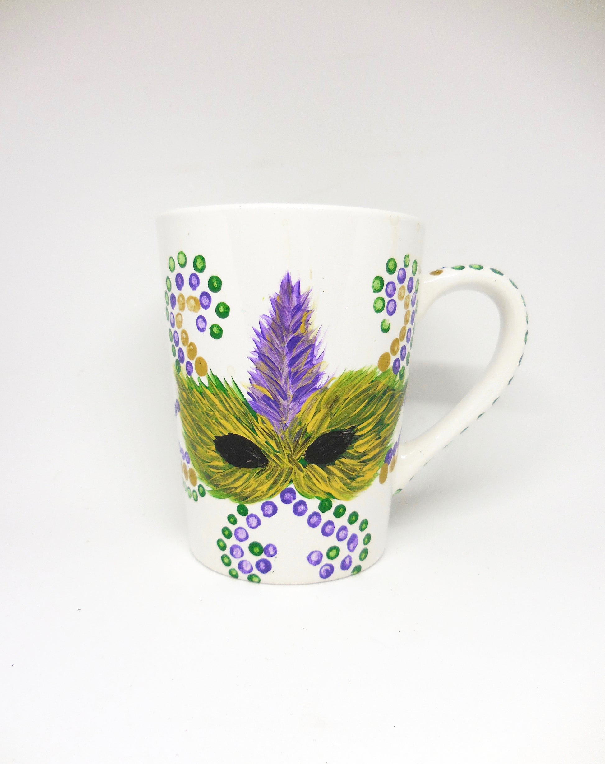 Add a touch of festive flair to your morning routine with our Mardi Gras Mask Coffee Mug. Hand-painted with vibrant colors and intricate mask designs, this mug captures the spirit of the lively Mardi Gras celebrations. Perfect for enjoying your coffee or tea with a dash of carnival charm, it combines playful artistry with everyday practicality, making each sip a vibrant celebration.