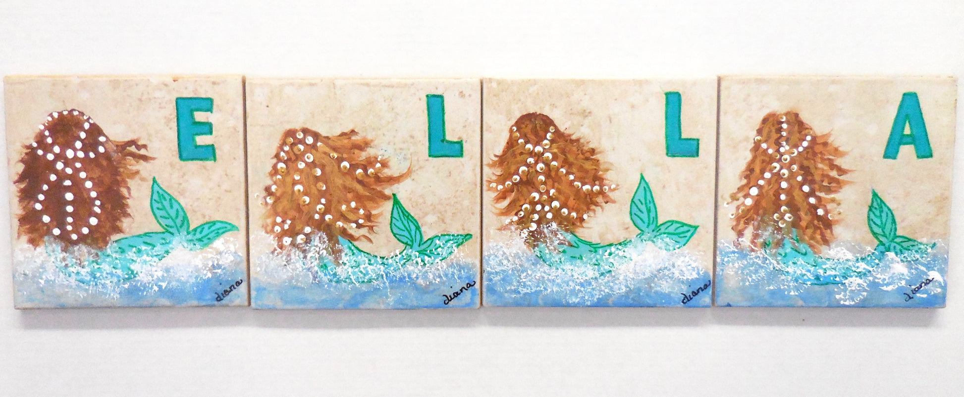Personalize your space with these Custom Ceramic Tiles, each featuring a stunning mermaid or design of your choosing, and a letter to spell out your name or a special word. Hand-painted with intricate details and vibrant colors, these tiles create a charming and unique display. They can be arranged to spell names, phrases, or meaningful words. Ideal for kitchens, bathrooms, or as a decorative touch in any room.