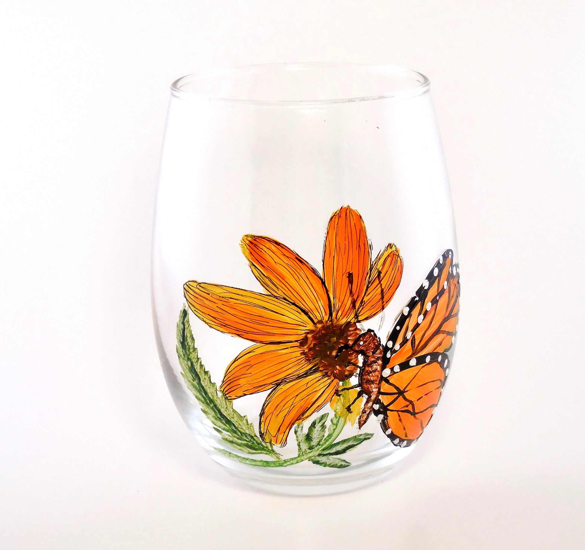 Bring a touch of nature's elegance to your table with this stemless wine glass featuring a vibrant monarch butterfly perched on a delicate yellow flower. The detailed hand-painted design showcases the butterfly's iconic orange and black wings against the bright petals, creating a stunning visual contrast. Perfect for wine enthusiasts and nature lovers alike, this glass is not only a beautiful addition to any collection but also a wonderful gift for those who appreciate the beauty of butterflies. Enjoy your favorite wine while celebrating the delicate charm of this exquisite design.