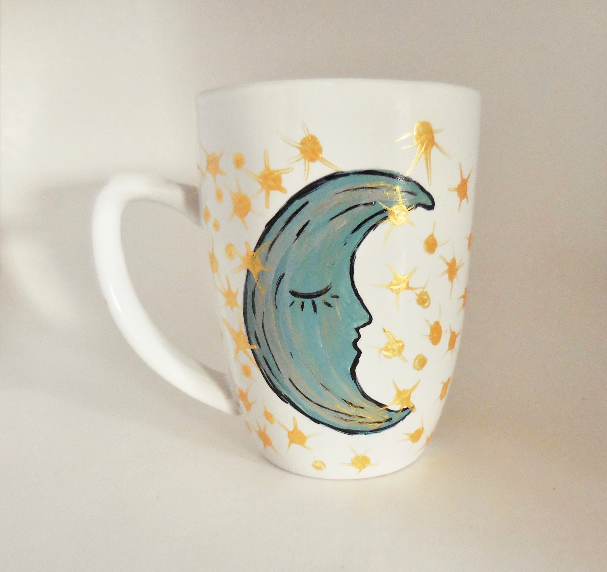 End your day on a sweet note with our Coffee Mug featuring a Moon and Stars. Hand-painted with a serene moon and twinkling stars, this mug is perfect for cozy evenings or bedtime routines. Ideal for sipping your favorite hot drink while sending a loving message, it combines comforting design with practical use for a warm and affectionate touch.