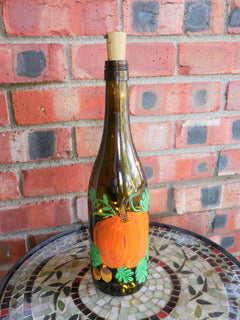 Celebrate the autumn season with this beautifully hand-painted wine bottle featuring a vibrant pumpkin design. The dark glass contrasts perfectly with the warm orange hues of the pumpkin, making it an eye-catching decorative piece. Illuminated from within by soft LED lights, this bottle adds a cozy, festive glow to your fall décor. Whether as a centerpiece for Halloween, Thanksgiving, or a charming accent for any room, this pumpkin-themed bottle brings a touch of rustic elegance and seasonal charm. Battery-operated for convenience, it’s perfect for creating a warm autumnal atmosphere.