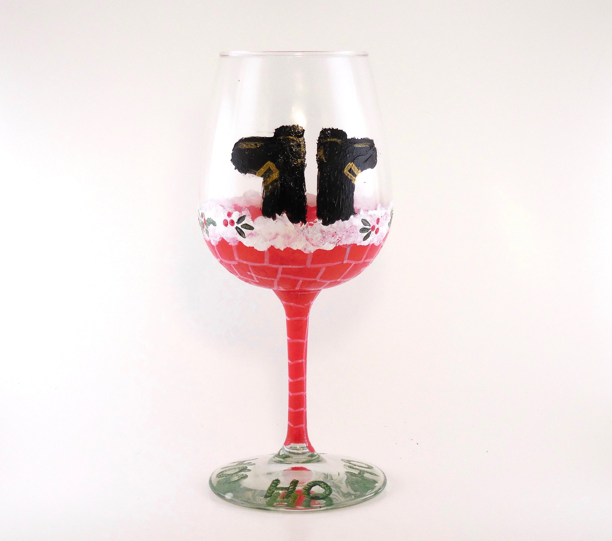 Celebrate the festive season with our Santa's Stuck Wine Glass. Hand-painted with a whimsical design of boots playfully sticking out of a chimney-style stem, this glass adds a touch of holiday fun and cheer to your wine-drinking experience. Perfect for holiday gatherings or as a unique gift, it combines festive charm with elegant functionality.