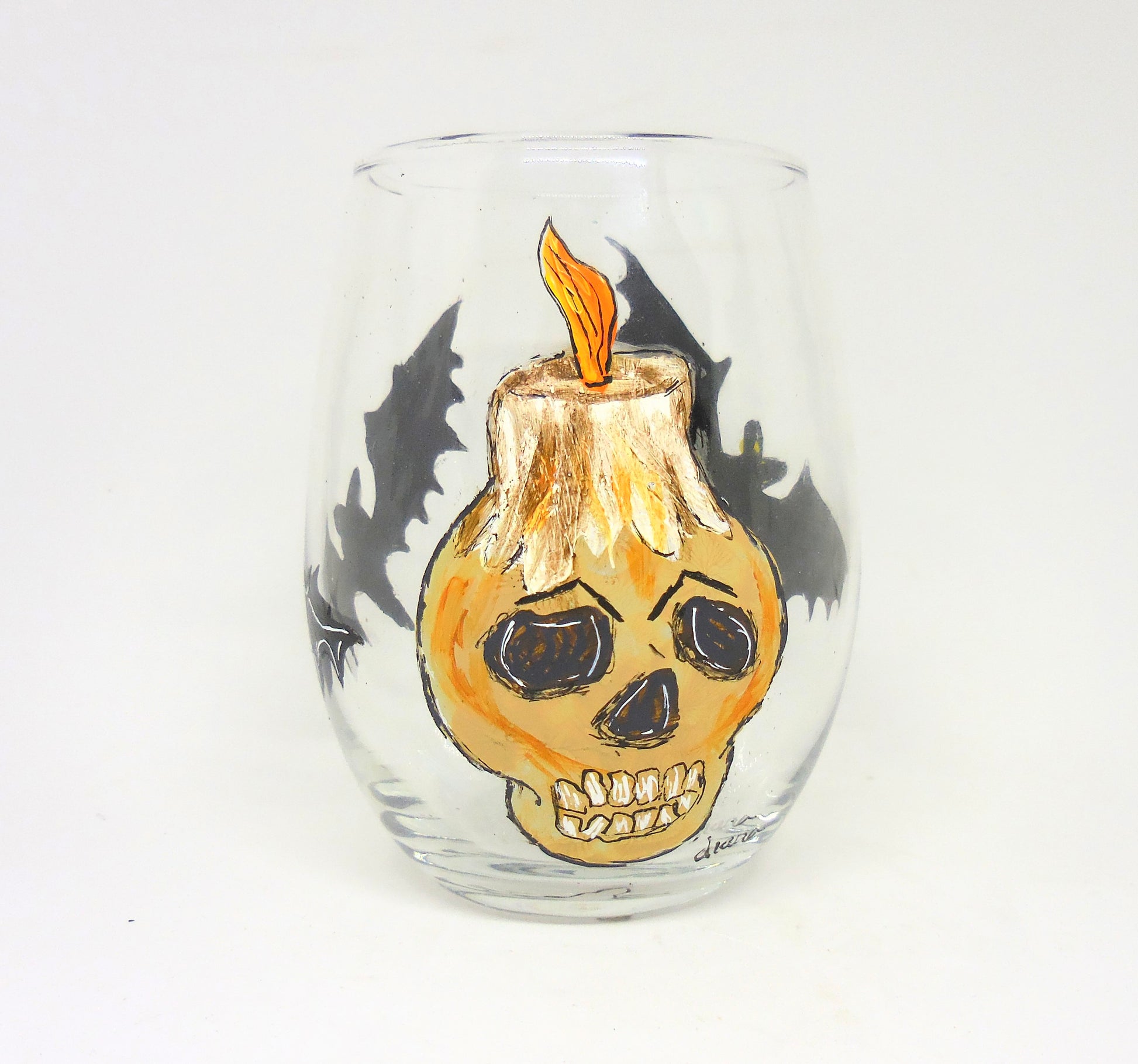 Embrace the spooky season with our Stemless Wine Glass featuring a Skull, Candle, and Bats. Hand-painted with a chillingly detailed skull, a flickering candle, and eerie bats in flight, this glass adds a thrilling touch to your Halloween festivities. Perfect for those who enjoy a mix of elegance and fright, it combines festive design with practical sophistication for a truly haunting experience.