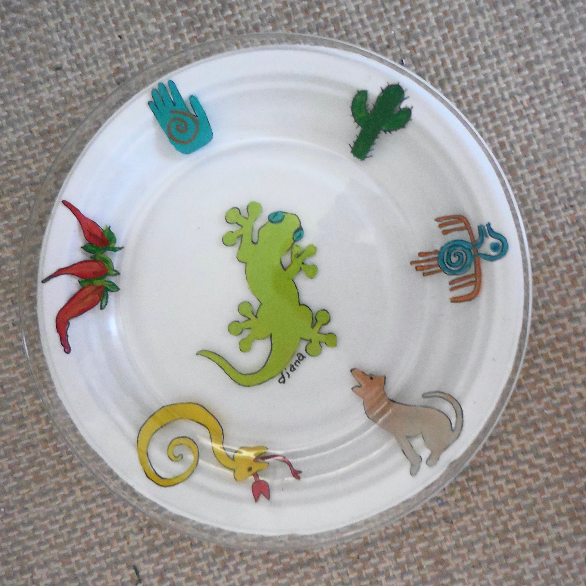 Enhance your table with our Southwestern Glass Plate featuring a Lizard Design. Hand-painted with intricate Southwestern motifs, including a vibrant lizard and additional desert-inspired elements, this plate captures the essence of the region's natural beauty. Perfect for serving or as a decorative piece, it combines cultural richness with practical elegance, bringing a touch of the Southwest to any setting.