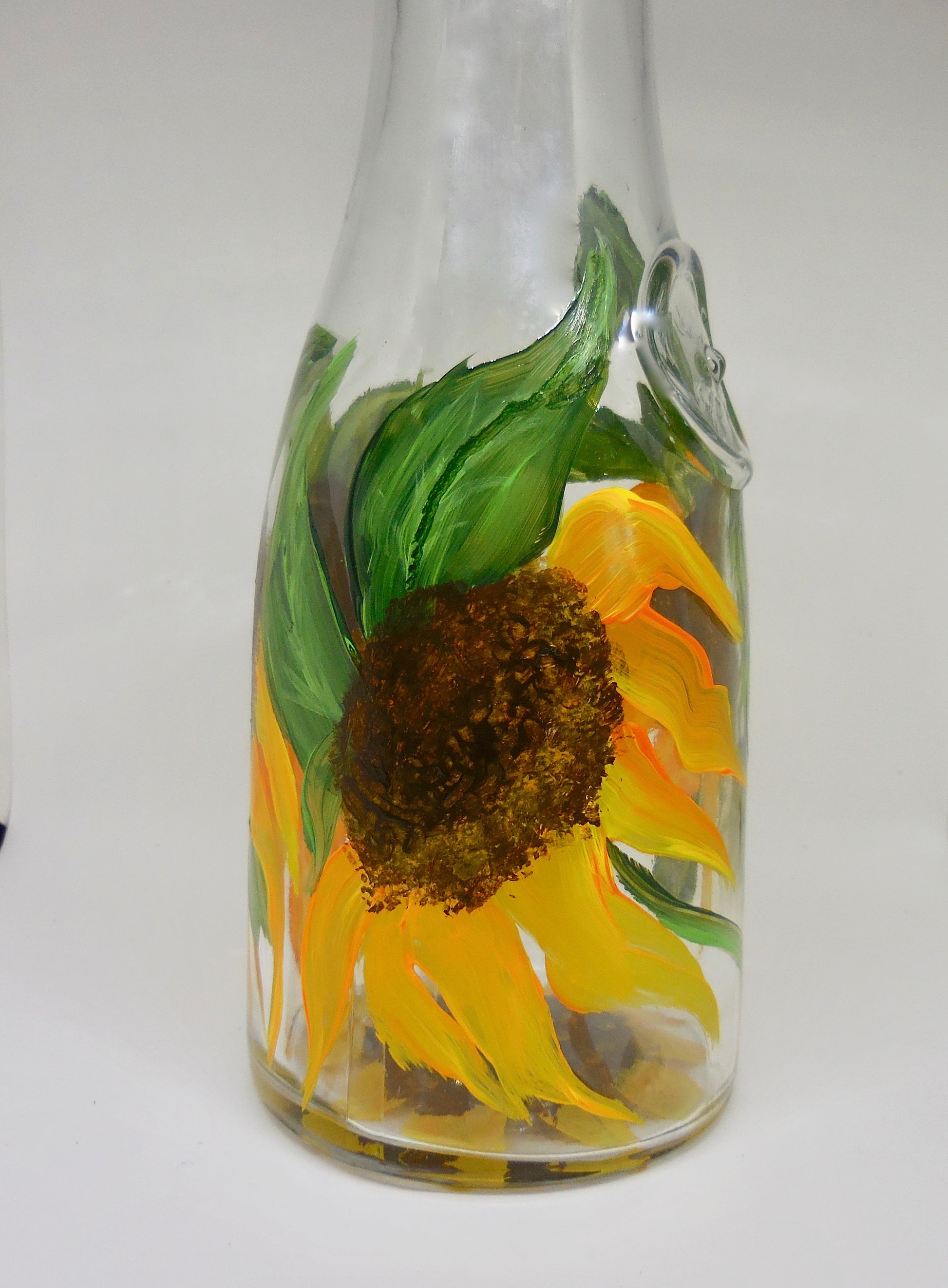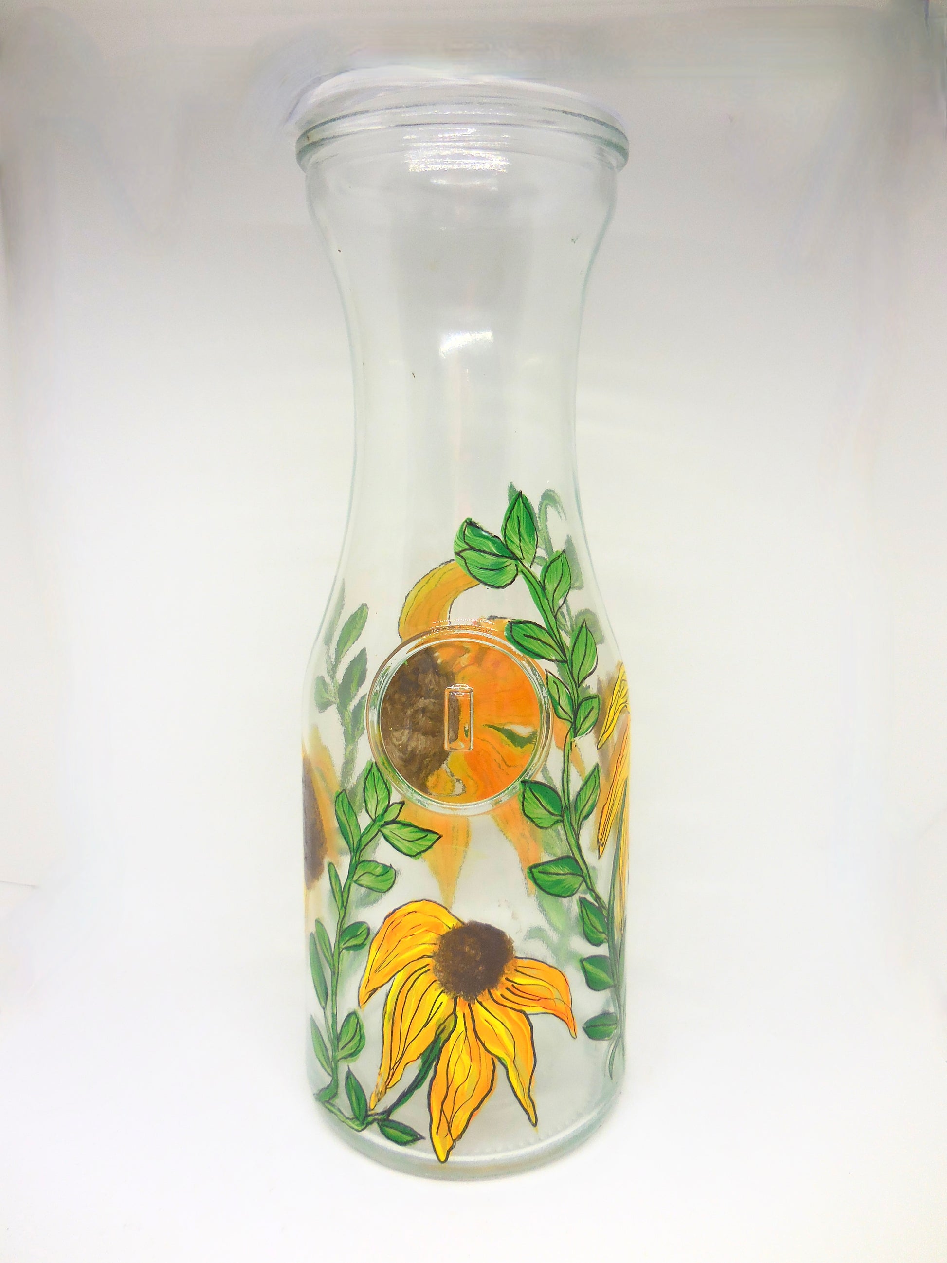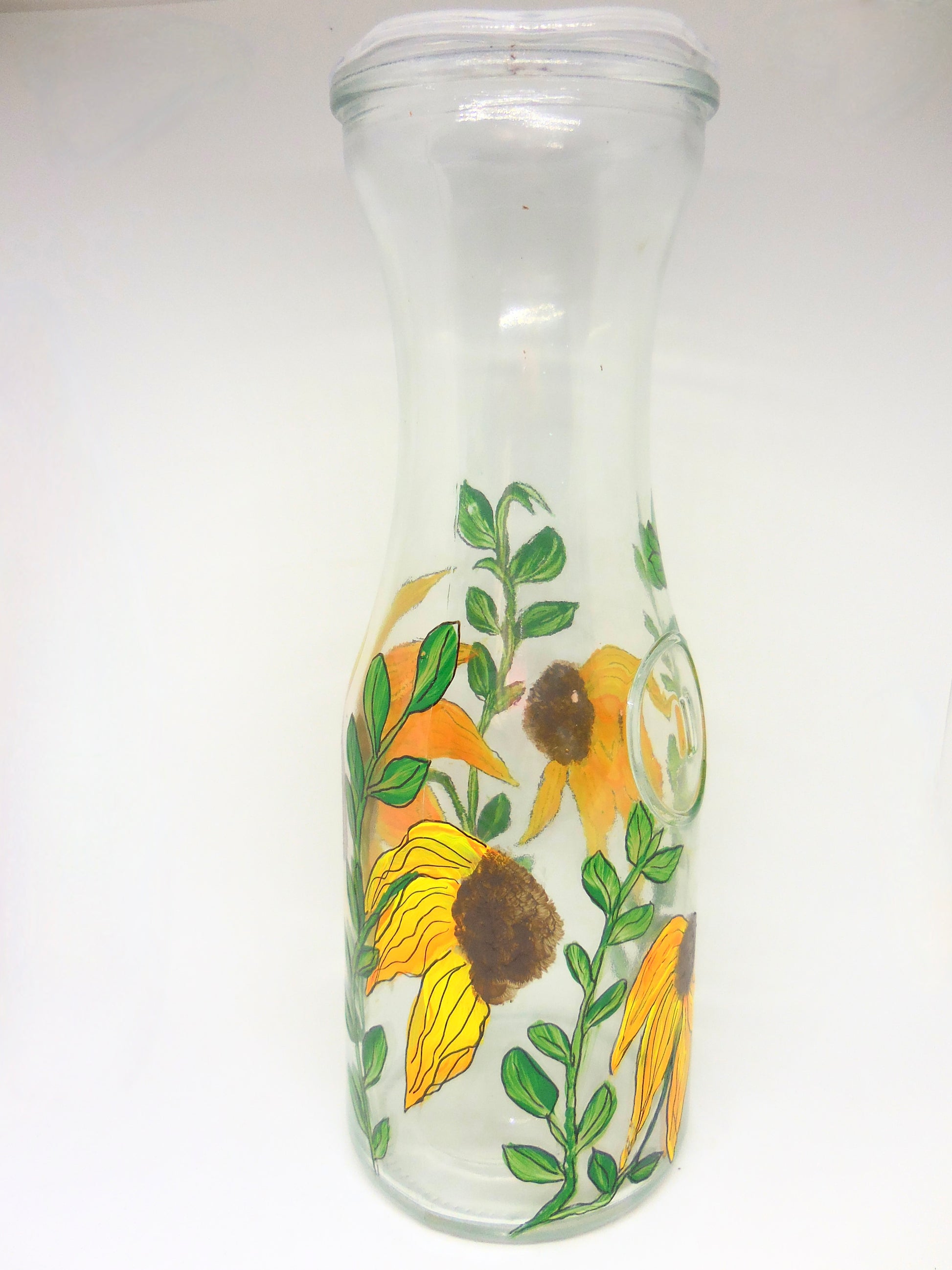 Add a splash of sunshine to your table with our Sunflower Carafe. This elegant glass carafe features a radiant sunflower design that brings a touch of cheer to any occasion. Whether you're serving water, juice, or your favorite beverages, the clear glass and vibrant sunflower artwork make this carafe a standout piece. Its sleek, ergonomic design ensures easy pouring and a comfortable grip, while the eye-catching floral motif adds a burst of brightness to your dining experience. Ideal for everyday use or special gatherings, this Sunflower Carafe is a perfect blend of beauty and function.