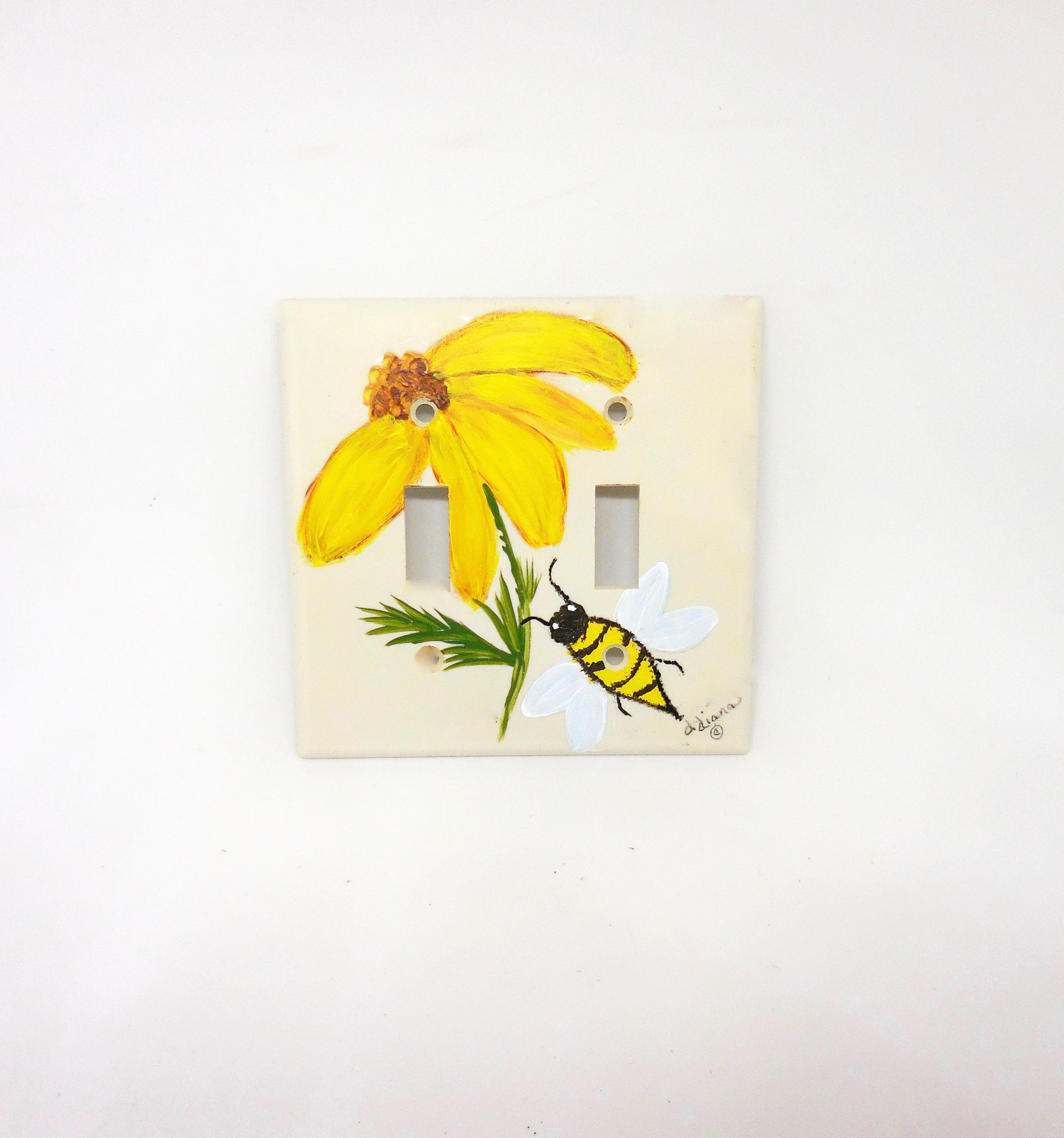 Add a touch of nature to your home with our Switchplate Cover featuring a Bee and a Flower. Hand-painted with a charming design of a busy bee and a blooming flower, this cover brings a delightful, whimsical touch to any room. Perfect for brightening up your space and adding a hint of floral and natural beauty to your décor. Screws included.