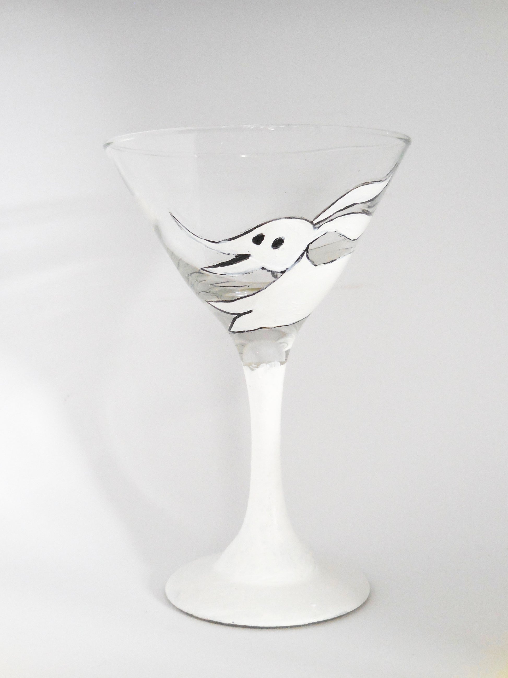 A Nightmare Before Christmas Zero Martini Glass features the beloved ghost dog, Zero, from Tim Burton's classic film. This martini glass showcases a beautifully detailed illustration of Zero, complete with his glowing pumpkin nose and floating ears, set against a swirling, eerie background reminiscent of Halloween Town. The elegant stem adds a touch of sophistication, while the unique design captures the whimsical yet spooky essence of the film. Perfect for fans of "The Nightmare Before Christmas," this glass is ideal for themed parties, holiday celebrations, or adding a bit of character to your glassware collection.